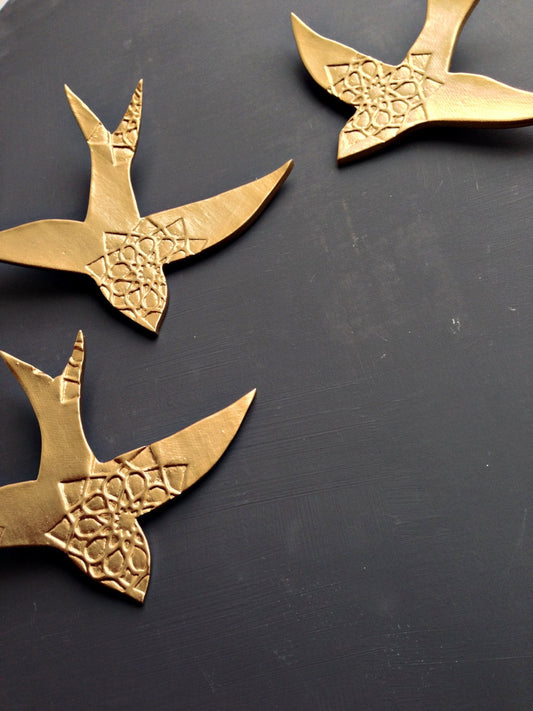 Original Artwork 3 Gold porcelain ceramic wall art swallows Ceramic sculpture Gold metallic birds Handmade pottery original unique art UK
