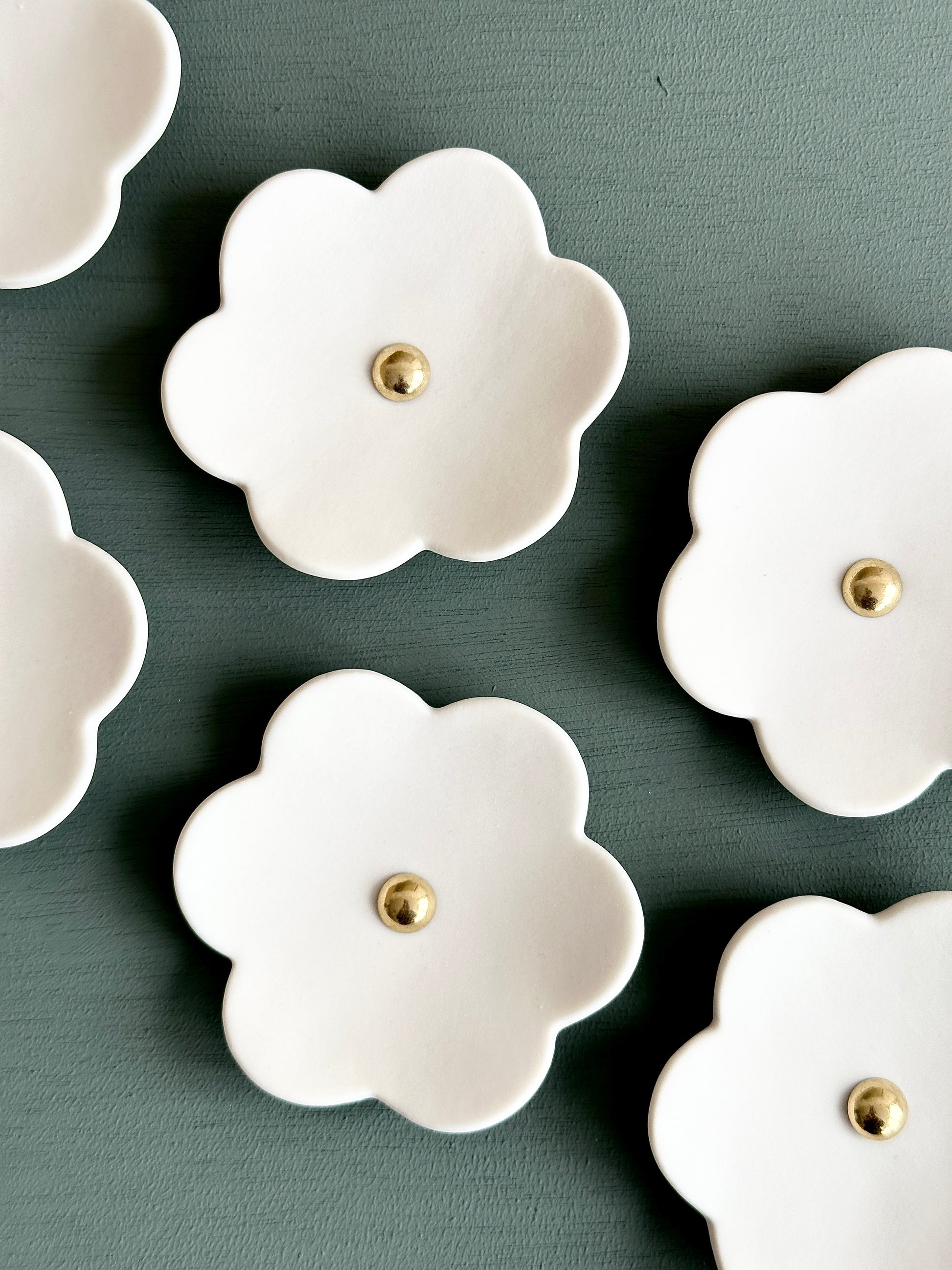 They're made from natural porcelain with golden studded centres to add detail. They are waterproof and cleanable, so they are perfect for kitchens and bathrooms, as well as bedrooms and living spaces.