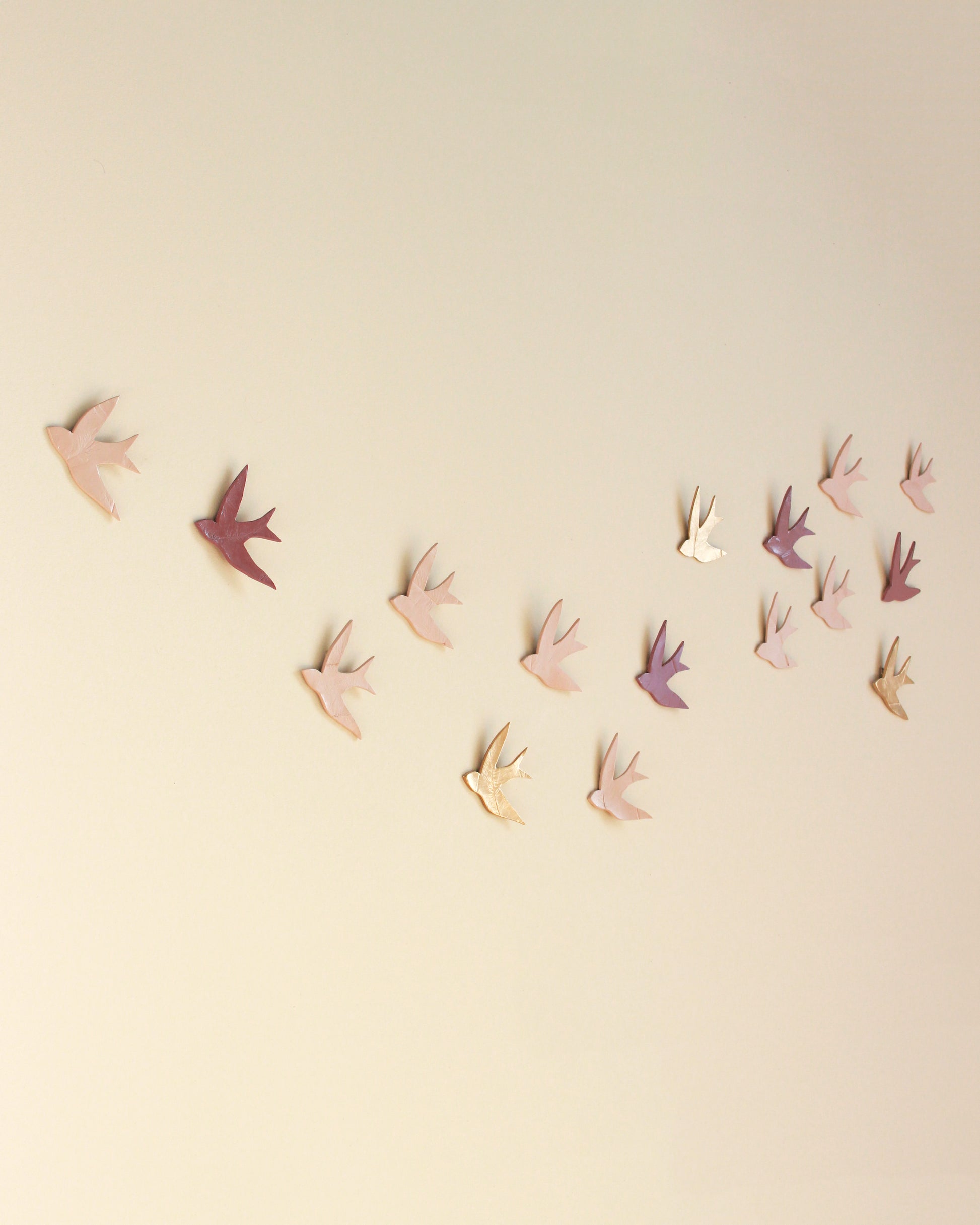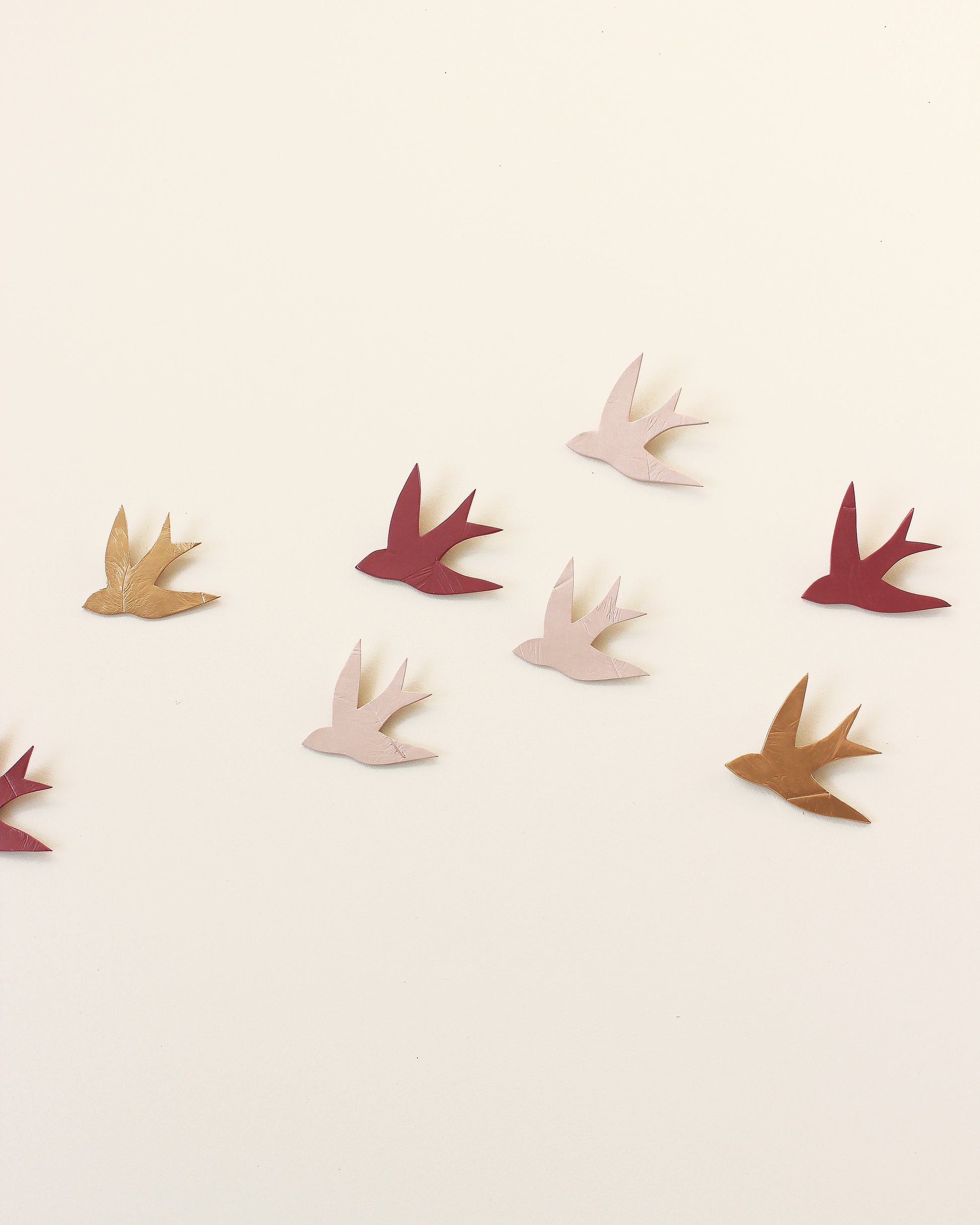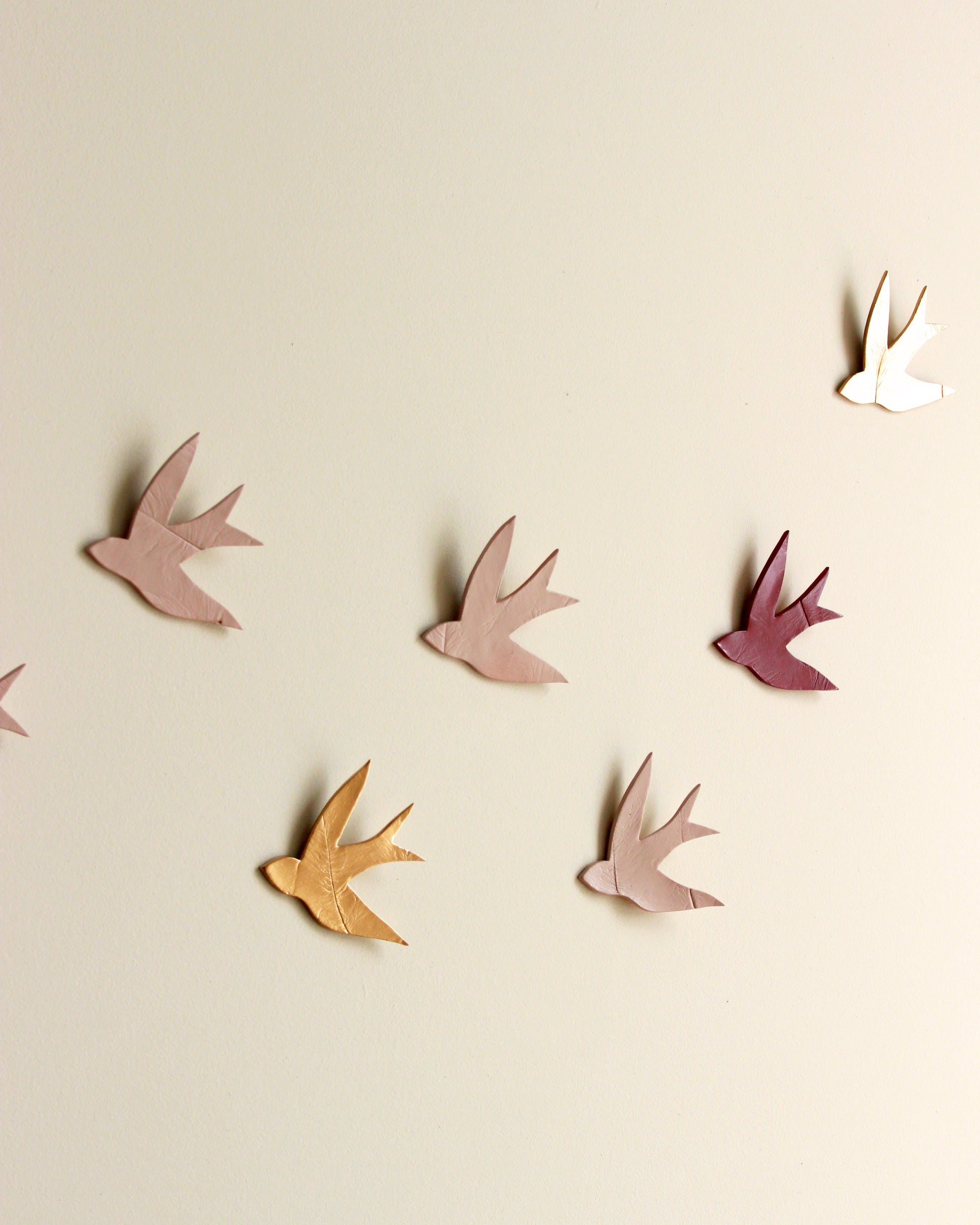 These pink and gold swallows from my swallow project form a group on the wall. This group is titled "Swallows at Dusk", and it's the perfect size to fit over a bed or sofa. The birds are are easy to arrange and install, or get in touch to ask about my design and template service. They can be arranged in any way that suits your space, so they are great for tricky spaces and hallways.