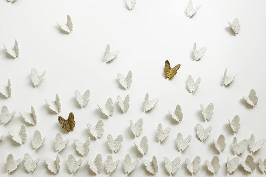 Flutter - Extra large wall art set of 60 3D Butterfly sculptures - Choose 60 white porcelain or 57 white and 3 gold finish handmade ceramic butterflies